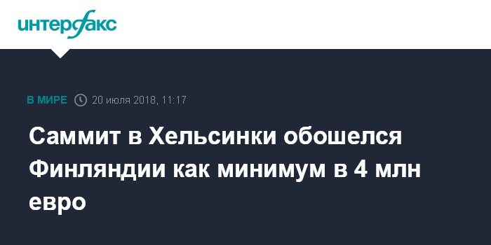 Москва. 20 июля. INTERFAX.RU - Стоимость организации и проведения встречи президентов России Владимира Путина и США - Дональда Трампа в Хельсинки, по предварительным данным, превысила 4 млн евро.