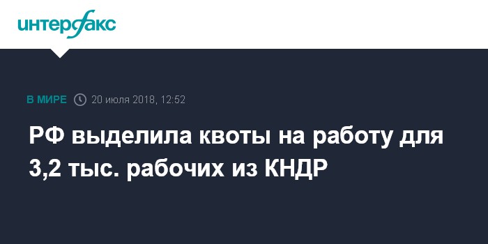Москва. 20 июля. INTERFAX.RU - Для рабочих из КНДР, которые могут работать на территории РФ, выделено около 3200 квот. Об этом сообщил глава Минвостокразвития, сопредседатель российско-северокорейской межправительственной комиссии по торгово-экономическому сотрудничеству Александр Козлов.