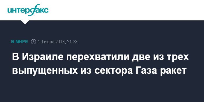 Москва. 20 июля. INTERFAX.RU - Три ракеты выпущены в пятницу с территории сектора Газа по югу Израиля, две из них перехвачены израильской системой ПРО "Железный купол", сообщает израильская радиостанция "Аруц Шева" (Седьмой канал) со ссылкой на армию обороны Израиля.