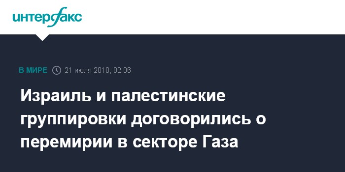 Москва. 21 июля. INTERFAX.RU - Палестинские группировки в секторе Газа подтвердили египетским посредникам, что достигли соглашения с Израилем о прекращении огня, сообщает в ночь на субботу газета Jerusalem Post.