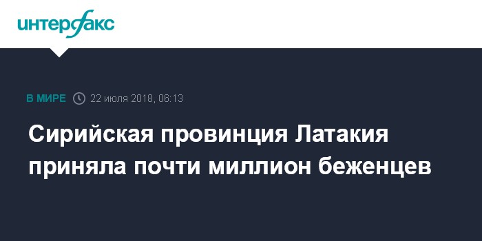 Москва. 22 июля. INTERFAX.RU - Сирийская провинция Латакия приняла уже около миллиона беженцев с других территорий страны, а также из других государств, сообщил губернатор провинции Ибрагим Худер Ал-Салем.