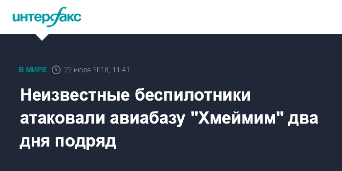 "В субботу, 21 июля 2018 года с наступлением темного времени суток российскими средствами противовоздушной обороны (ПВО) авиабазы "Хмеймим" на значительном удалении была выявлена малоразмерная воздушная цель (БПЛА) неизвестной принадлежности, приближавшаяся к российскому военному объекту. Штатными зенитными огневыми средствами российской авиабазы воздушная цель была уничтожена", - заявил представитель авиабазы.
