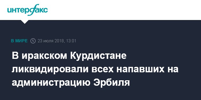 Москва. 23 июля. INTERFAX.RU - Службы безопасности ликвидировали трех человек, участвовавших в нападении на здание администрации столицы иракского Курдистана Эрбиля, передает в понедельник курдский телеканал "Рудау".