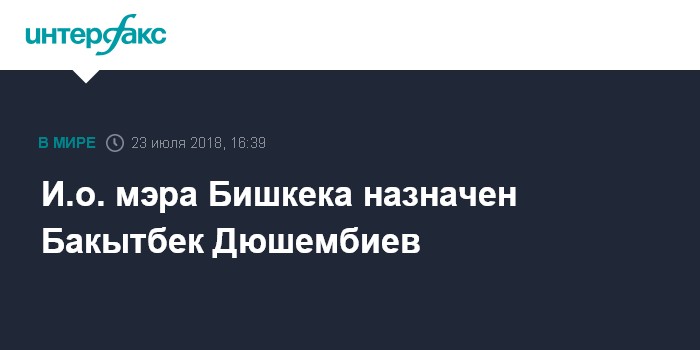 Москва. 23 июля. INTERFAX.RU - Исполняющим обязанности мэра киргизской столицы назначен Бакытбек Дюшембиев, соответствующее распоряжение подписал премьер-министр Киргизии Мухаммедкалый Абылгазиев, сообщили в понедельник "Интерфаксу" в пресс-службе правительства страны.