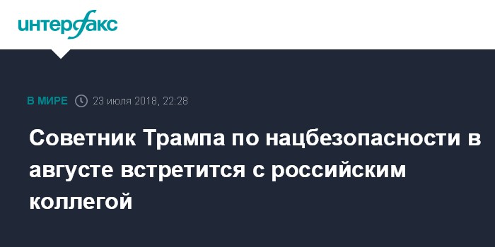 Москва. 23 июля. INTERFAX.RU - Советник президента США по нацбезопасности Джон Болтон планирует в августе встретиться со своим "российским коллегой", сообщила в понедельник пресс-секретарь Белого дома Сара Сандерс.