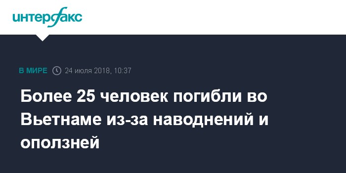 Москва. 24 июля. INTERFAX.RU - По меньшей мере 27 человек погибли, десятки пострадали в результате наводнений и оползней, вызванных тропическим штормом Сонтинь во Вьетнаме, говорится в распространенном во вторник заявлении местной службы реагирования на стихийные бедствия.