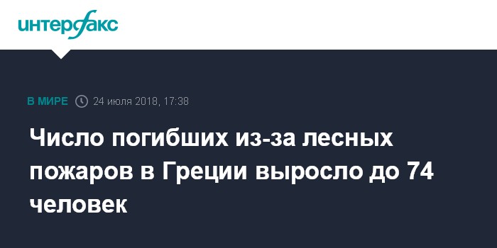 Москва. 24 июля. INTERFAX.RU - Разгоревшиеся в Греции лесные пожары, по последним данным, привели к гибели 74 человек, передают во вторник европейские СМИ со ссылкой на греческую пожарную службу.