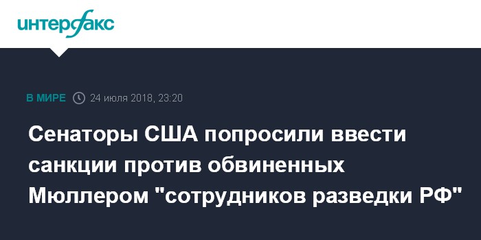 Москва. 24 июля. INTERFAX.RU - Американский сенатор-демократ Крис Ван Холлен и сенатор-республиканец Пэти Туми направили письмо в Минфин США с просьбой ввести финансовые санкции против 12 предполагаемых сотрудников российских разведслужб, против которых в США были выдвинуты обвинения в рамках расследования спецпрокурора Роберта Мюллера, сообщает во вторник издание The Hill.