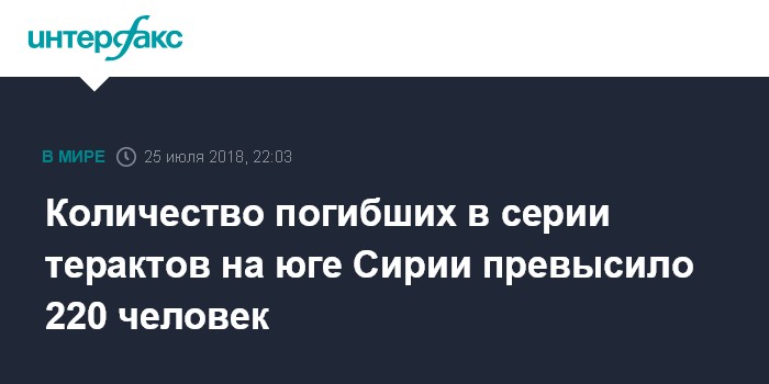 Москва. 25 июля. INTERFAX.RU - По меньшей мере 221 человек погиб в среду в результате серии терактов в районе города Сувейда на юге Сирии и столкновений правительственных сил и боевиков ИГ (террористическая группировка, запрещена в РФ), сообщают западные СМИ со ссылкой на наблюдателей, близких к сирийской оппозиции.
