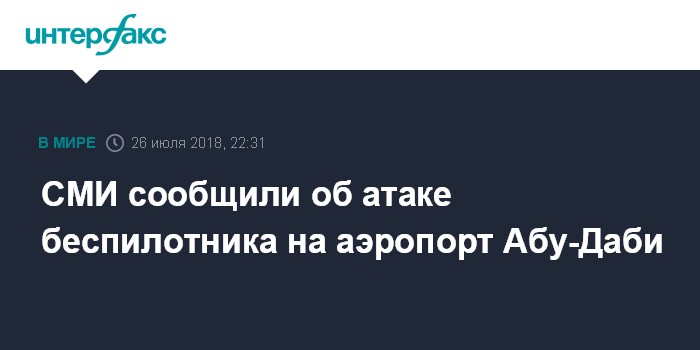 Москва. 26 июля. INTERFAX.RU - Йеменские мятежники-хуситы нанесли удар по международному аэропорту Абу-Даби (ОАЭ) с помощью беспилотника, сообщает в четверг межарабский телеканал Al Arabiya со ссылкой на контролируемые хуситами СМИ.