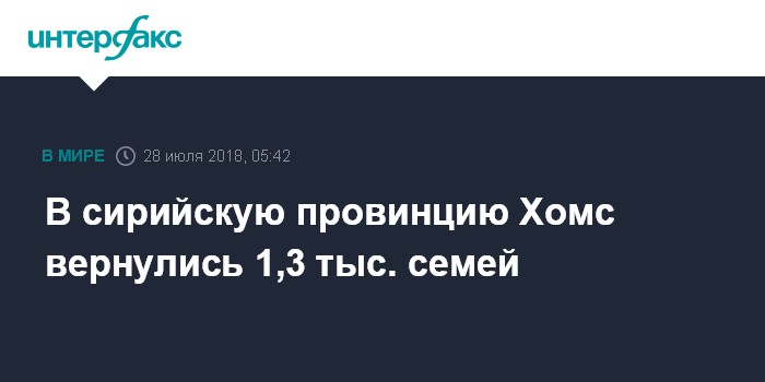 Москва. 28 июля. INTERFAX.RU - Более 1,3 тыс. семей беженцев вернулись в провинцию Хомс в Сирии после ее освобождения от боевиков, сообщил губернатор провинции Таляль Аль Барази.