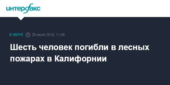 Москва. 29 июля. INTERFAX.RU - Лесные пожары, разгоревшиеся на этой неделе в Калифорнии, привели к гибели шести человек, сообщают в воскресенье американские СМИ.