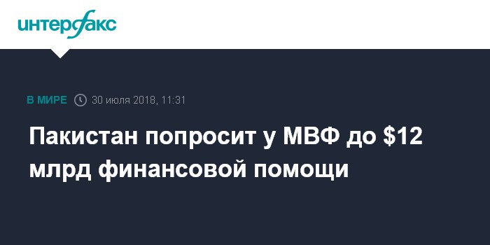 Москва. 30 июля. INTERFAX.RU - Новое правительство Пакистана планирует обратиться в Международный валютный фонд (МВФ) за самой большой кредитной линией в истории страны - от $10 млрд до $12 млрд, пишет The Financial Times со ссылкой на информированные источники.