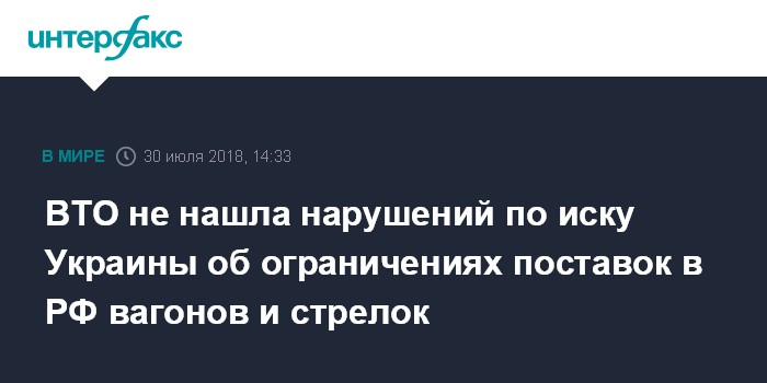 Москва. 30 июля. INTERFAX.RU - Всемирная торговая организация (ВТО) не нашла нарушений по иску Украины, выражавшей недовольство ограничениями на поставки в РФ вагонов и стрелочных переводов.