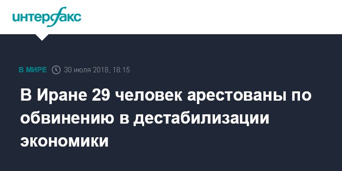 Москва. 30 июля. INTERFAX.RU - Власти Ирана арестовали 29 человек, которым вменяют в вину действия по дестабилизации национальной экономики, передает в понедельник агентство "Фарс".