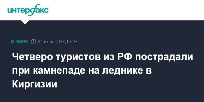 Москва. 31 июля. INTERFAX.RU - В МЧС Киргизии подтвердили, что четверо россиян пострадали в результате камнепада на леднике Скрябина на севере Киргизии.