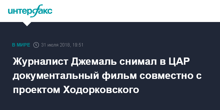 Москва. 31 июля. INTERFAX.RU - Журналист Орхан Джемаль, режиссер Александр Расторгуев и оператор Кирилл Радченко приехали в Центральноафриканскую республику 28 июля для съемок документального фильма совместно с "Центром управления расследованиями" Михаила Ходорковского, сообщила заместитель руководителя ЦУР Анастасия Горшкова.