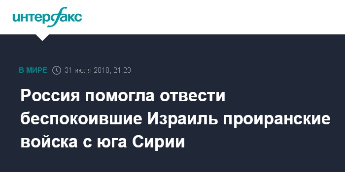 "Иранские силы, действительно, были отведены из этого района (южной зоны деэскалации на территории Сирии - ИФ) для того, чтобы не раздражать руководство Израиля, которое стало все чаще и чаще прибегать к силовым методам нанесения каких-то ударов по отдельным объектам иранцев, которые находились в этом районе", - сказал Лаврентьев в интервью "Интерфаксу".