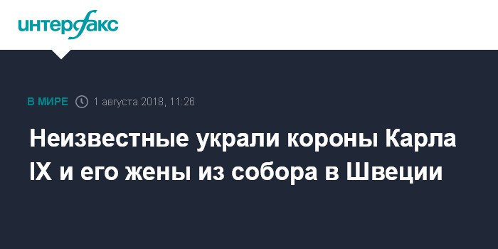 Москва. 1 августа. INTERFAX.RU - Воры вынесли короны короля Швеции Карла IX и его супруги, а также королевскую державу из собора в шведском городе Стренгнес к северу от Стокгольма, сообщает в среду британская газета The Guardian.