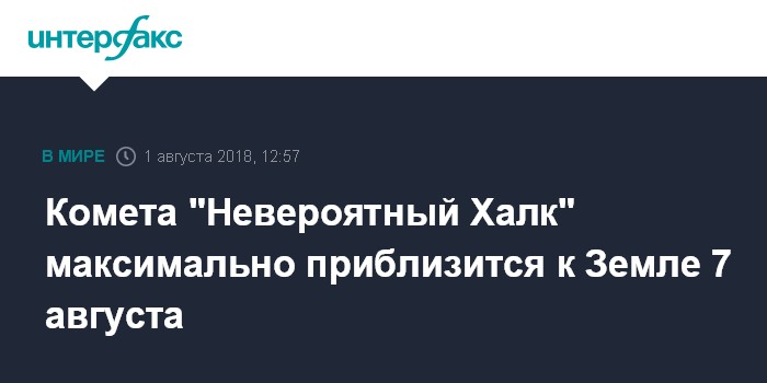 Москва. 1 августа. INTERFAX.RU - Гигантская комета, получившая из-за своих размеров название "Невероятный Халк", 7 августа сблизится с Землей на минимальное расстояние, и ее газопылевое окружение может вызвать определенные электромагнитные процессы в околоземном пространстве. Об этом рассказал в среду "Интерфаксу" российский исследователь кометных метеоритов Евгений Дмитриев.