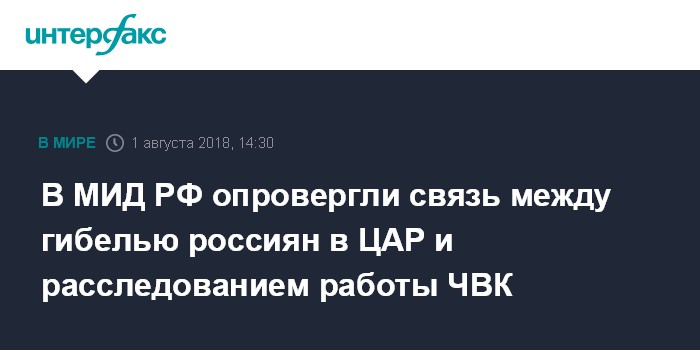 Москва. 1 августа. INTERFAX.RU - Официальный представитель МИД РФ Мария Захарова назвала абсурдными сообщения ряда СМИ о связи между гибелью российских журналистов в Центральноафриканской Республике (ЦАР) с расследованием деятельности в этой стране неких частных военных компаний.