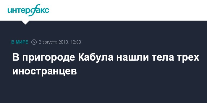 Москва. 2 августа. INTERFAX.RU - Тела трех иностранных граждан обнаружены в пригороде Кабула, сообщили местные СМИ со ссылкой на полицию афганской столицы.