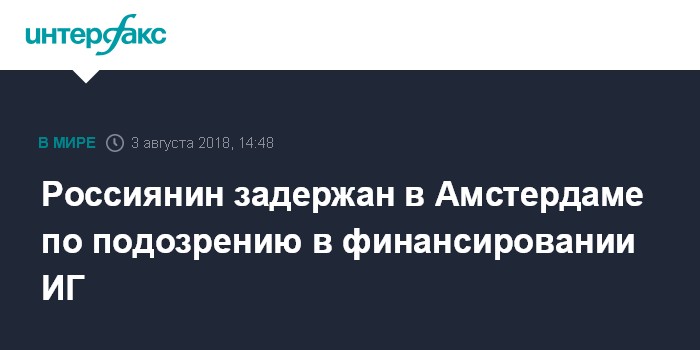 Москва. 3 августа. INTERFAX.RU - Голландские правоохранительные органы задержали в Амстердаме гражданина России, подозреваемого в оказании финансовой помощи террористической группировке "Исламское государство" (ИГ, запрещена в РФ), сообщает в пятницу агентство Associated Press.