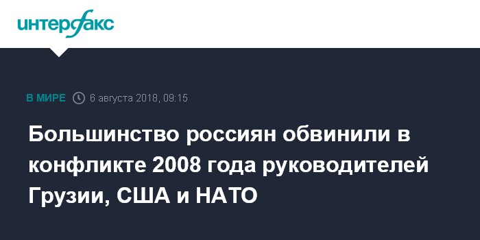 Москва. 6 августа. INTERFAX.RU - В вооруженном конфликте России и Грузии, возникшем в связи с событиями в Южной Осетии и Абхазии в августе 2008 года, виновно руководство Грузии, США и стран НАТО, считают около 60% россиян. Об этом свидетельствуют предоставленные "Интерфаксу" результаты опроса "Левада-центра".