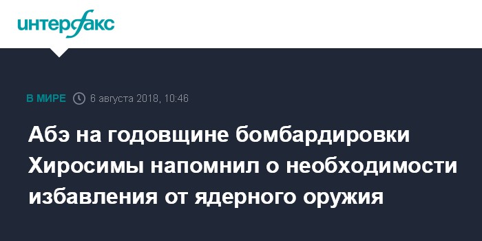 "Наш народ, придерживаясь принципов отказа от ядерного оружия, будет упорно играть роль моста между двумя сторонами (странами с ядерным оружием и без - ИФ) и возглавлять усилия международного сообщества (по избавлению мира от ядерного оружия - ИФ)", - отметил Абэ.