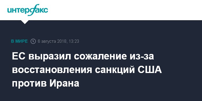 Москва. 6 августа. INTERFAX.RU - ЕС выражает сожаление в связи с восстановлением санкций США в отношении Ирана, говорится в совместном заявлении главы дипломатии ЕС Федерики Могерини и глав МИД Франции, Германии и Великобритании.