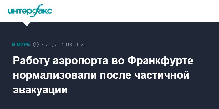 Москва. 7 августа. INTERFAX.RU - Полиция Франкфурта-на-Майне объявила о возвращении в нормальный режим работы аэропорта, где ранее во вторник были частично эвакуированы пассажиры из первого терминала после того, как мужчина, не имевший необходимого доступа, проник в зону безопасности.
