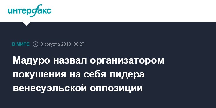 Москва. 8 августа. INTERFAX.RU - Президент Венесуэлы Николас Мадуро во вторник вечером выступил с телеобращением и заявил, что за покушением на него стоит один из венесуэльских оппозиционных лидеров, проживающих в Колумбии, сообщает информагентство Associated Press.
