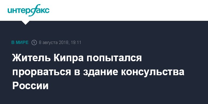 "7 августа около 13:00 44-летний гражданин Республики Кипр намеренно врезался на автомобиле в ограду почетного консульства Российской Федерации в Лимасоле, после чего пытался ворваться в здание, разбив стекло входной двери. Силами сотрудников почетного консульства и оперативно подоспевшей полиции он был обезврежен. Пострадавших в результате данного инцидента нет, зданию нанесен незначительный ущерб", - говорится в сообщении дипмиссии в фейсбуке.
