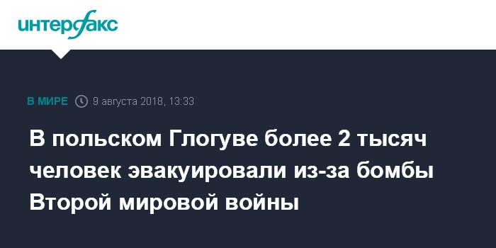 Москва. 9 августа. INTERFAX.RU - Экстренные службы эвакуировали от двух до трех тысяч человек в городе Глогув на западе Польши после того, как в черте города была обнаружена неразорвавшаяся бомба времен Второй мировой войны, передает АР.