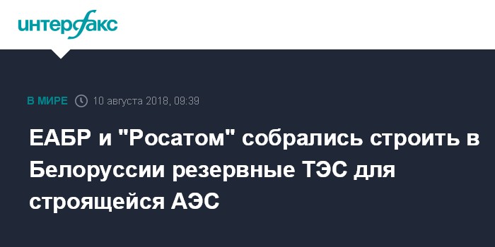 Москва. 10 августа. INTERFAX.RU - Белоруссия собирается построить 800 МВт газовой генерации, которая должна стать резервом для первого блока строящейся Белорусской АЭС (БелАЭС), средства на это может дать Евразийский банк развития (ЕАБР), а его партнером по строительству является ГК "Росатом", пишет в пятницу "Коммерсантъ".