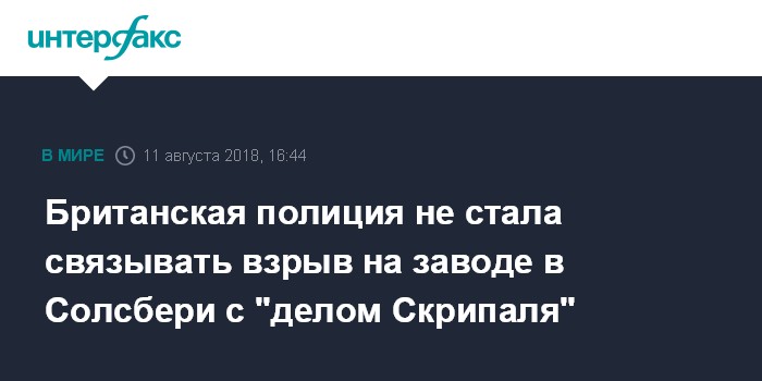 Москва. 11 августа. INTERFAX.RU - Взрыв, произошедший в ночь на субботу близ британской химической лаборатории "Портон-Даун" не имеет никакого отношения к делу о попытке отравления в Солсбери экс-сотрудника ГРУ Сергея Скрипаля и его дочери, сообщили в полиции.