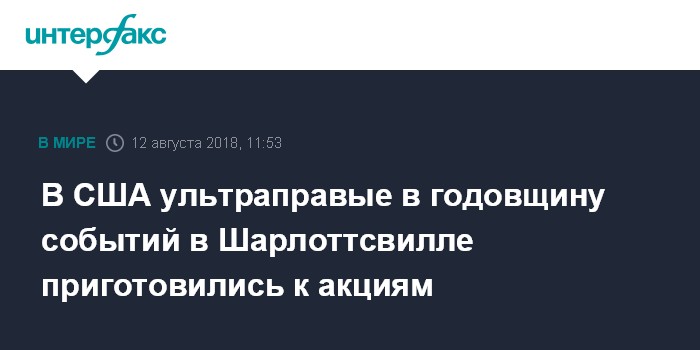 Москва. 12 августа. INTERFAX.RU - Сторонники ультраправых и их оппоненты в воскресенье - в годовщину всплеска насилия в Шарлоттсвилле (штат Вирджиния) - собираются выйти на демонстрации в Вашингтоне, к Белому дому, сообщает издание The Hill.