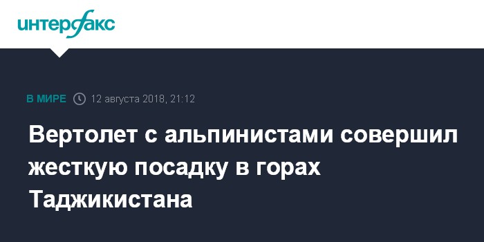 Москва. 12 августа. INTERFAX.RU - В Таджикистане при транспортировке альпинистов, совершивших восхождения на пик Исмоили Сомони (быв. Пик Коммунизма), в базовый лагерь в низовьях ледника Фортамбек, совершил жесткую посадку вертолет Ми-8, сообщила "Интерфаксу" в воскресенье вечером начальник пресс-центра Комитета по ЧС и ГО при правительстве республики Умеда Юсуфи.