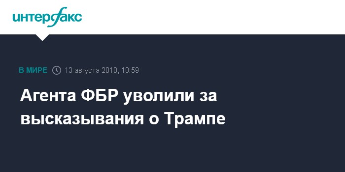 Москва. 13 августа. INTERFAX.RU - Руководство ФБР уволило агента Питера Строка, ранее отстраненного от участия в расследовании предполагаемого вмешательства РФ в американские выборы за негативные высказывания о президенте США Дональде Трампе. Об этом сообщает в понедельник телеканал CNBC со ссылкой на адвоката бывшего агента.