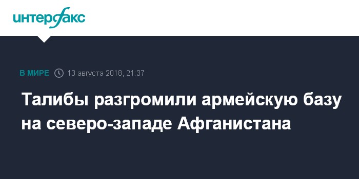 Москва. 13 августа. INTERFAX.RU - В граничащей с Туркменистаном афганской провинции Фарьяб, на северо-западе страны, боевики радикального движения "Талибан" (запрещено в России - ИФ) захватили базу правительственных войск. Об этом сообщил вечером в понедельник телеканал 1TV со ссылкой на источник в структурах безопасности Афганистана.
