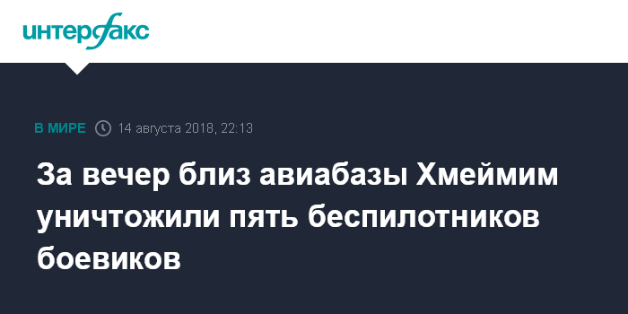Москва. 14 августа. INTERFAX.RU - Боевики продолжают атаковать авиабазу "Хмеймим" беспилотниками, с начала августа уничтожено уже 16 таких беспилотных летательных аппаратов (БПЛА), сообщил руководитель российского Центра по примирению враждующих сторон в Сирии Алексей Цыганков.