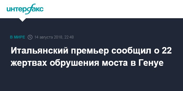 Москва. 14 августа. INTERFAX.RU - Председатель совета министров Италии Джузеппе Конте во вторник прибыл на место обрушения моста в итальянском городе Генуя, сообщает итальянское телевидение. По его словам, жертвами обрушения стали 22 человека, еще 16 получили травмы, при этом девять пострадавших находятся в тяжелом состоянии.