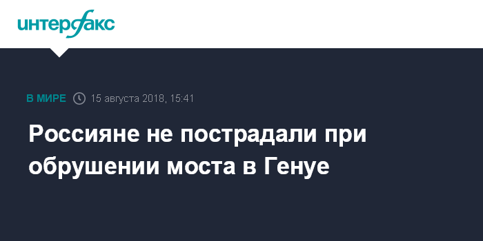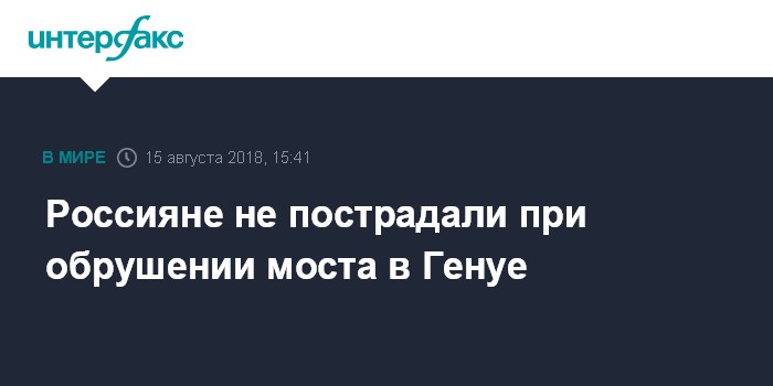 Москва. 15 августа. INTERFAX.RU - Россияне не пострадали в результате обрушения моста в Генуе, сообщили в МИД РФ.