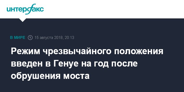 Днем 14 августа в Генуе рухнул пролет автомобильного моста на высоте свыше 100 метров. В результате трагедии, по последним данным, погибли 39 человек, еще 16 получили травмы. По данным местных властей, причиной обрушения 200-метрового пролета моста могло стать ослабление несущих конструкций. Состояние конструкции, как отмечают итальянские СМИ, уже давно вызывало опасения у специалистов.