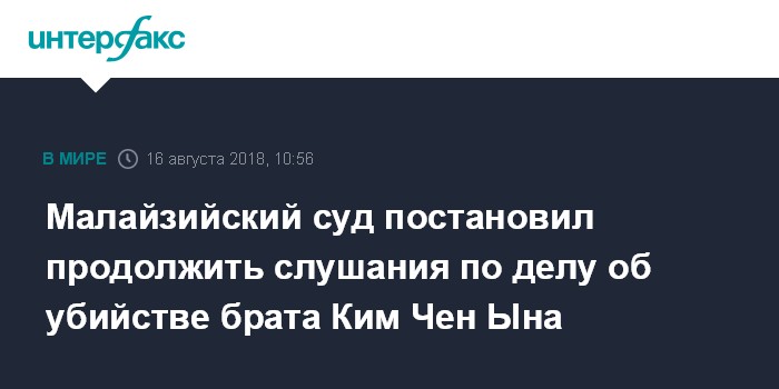 Москва. 16 августа. INTERFAX.RU - Высокий суд Малайзии постановил в четверг продолжить судебное разбирательство по делу об убийстве сводного брата лидера КНДР Ким Чен Ына Ким Чон Нама, сообщает Channel NewsAsia.