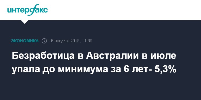 Москва. 16 августа. INTERFAX.RU - Безработица в Австралии в июле опустилась до минимальной отметки за шесть лет - 5,3% по сравнению с 5,4% месяцем ранее, свидетельствуют данные Австралийского бюро статистики.