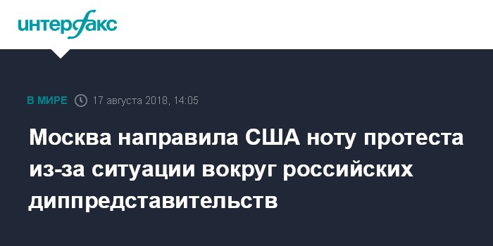 "В связи с продолжающимся грубым нарушением Соединенными Штатами Америки норм международного права в отношении дипломатических представительств и консульских учреждений Российской Федерации на территории США министерство иностранных дел РФ выразило Государственному департаменту решительный протест, направив по дипломатическим каналам соответствующую ноту", - говорится в сообщении МИД РФ, опубликованном на его сайте в пятницу.