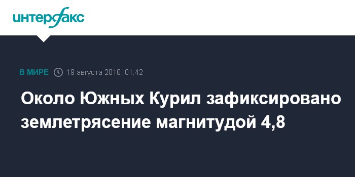 Москва. 19 августа. INTERFAX.RU - Землетрясение магнитудой 4,8 зарегистрировано рано утром в воскресенье в Тихом океане возле Южных Курил, сообщили агентству "Интерфакс" в Сахалинском филиале единой Геофизической службы РАН.