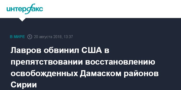 Москва. 20 августа. INTERFAX.RU - Соединенные Штаты препятствуют восстановлению районов Сирии, контролируемых правительством САР, заявил глава МИД РФ Сергей Лавров на пресс-конференции по итогам двусторонней встречи в главой внешнеполитического ведомства Ливана Джебраном Басилем.