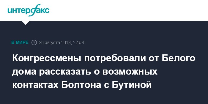 Москва. 20 августа. INTERFAX.RU - Два члена палаты представителей США от Демократической партии США направили письмо в Белый дом с требованием предоставить документы, которые могли бы дать информацию о возможных контактах советника президента США по национальной безопасности Джона Болтона и россиянки Марии Бутиной, сообщает в понедельник издание The Hill.